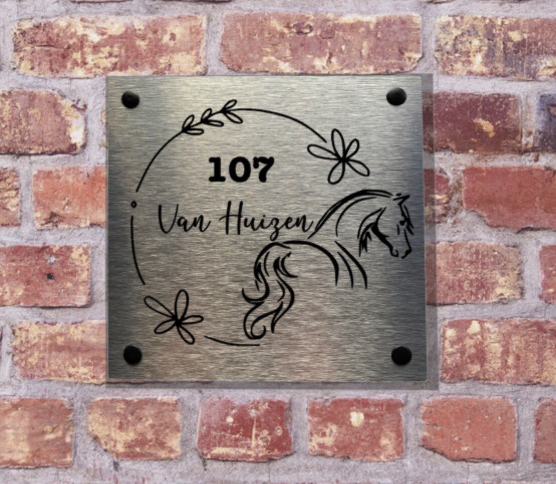 Het naambordje RVS-look is gemaakt van aluminium paneel (dikte 3 mm) met een geborstelde toplaag. is 20 bij 20 cm en is 3 mm dik.En wordt geleverd met 4 afstandhouders, schroeven en pluggen voor de montage.
